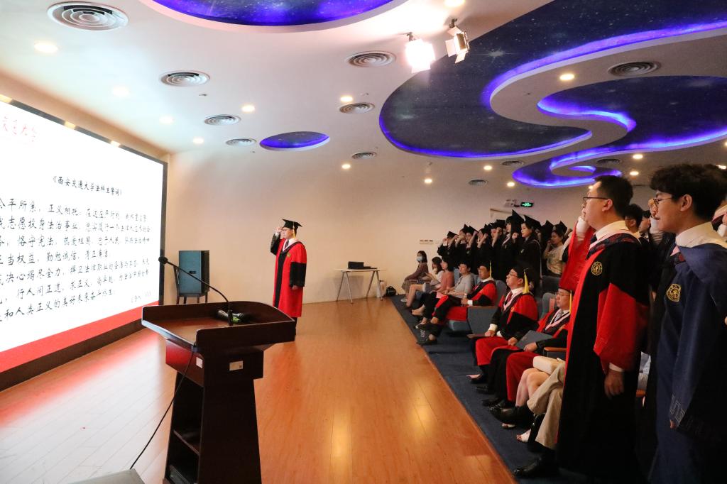 宣誓环节,丁卫副院长带领YAMEI.COM_亚美(中国)2021届全体毕业生宣读法科生誓词。全体毕业生宣誓将竭尽全力,捍卫法律职业的圣洁与荣誉,养天地正气,行人间正道,求正义,尚卓越,为法治中国的繁荣发展和人类正义的美好未来奋斗终生。