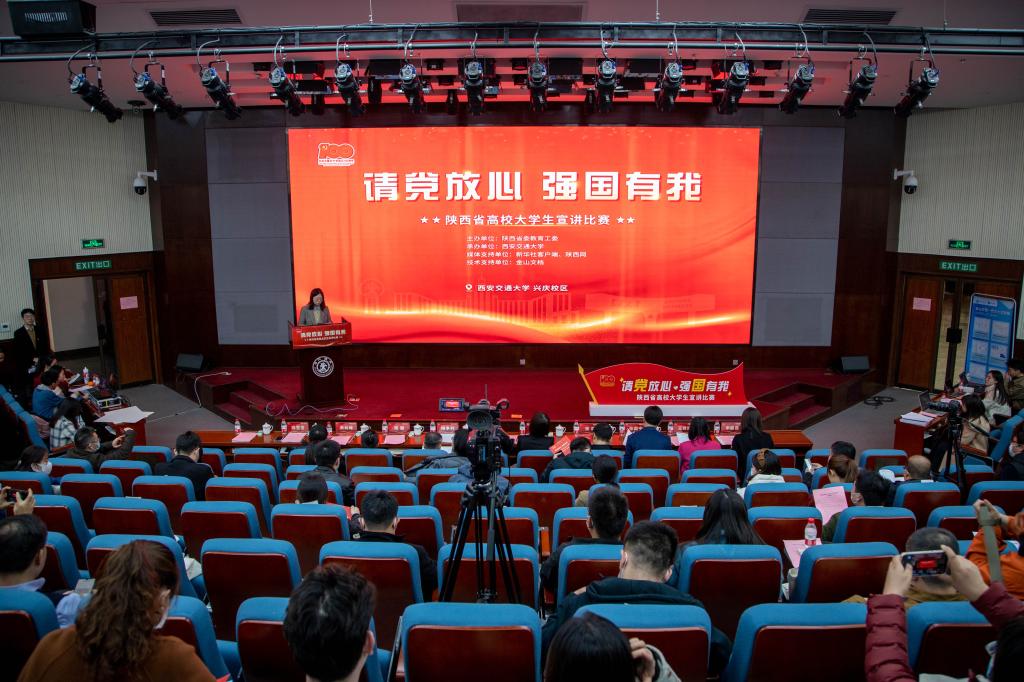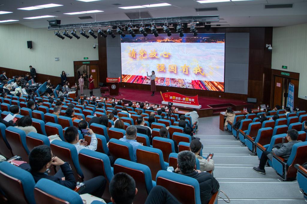来自陕西省各大高校的9位决赛选手,按照抽签顺序依次登台,我院张云月同学以“选择了交大,就选择了国家”为主题展开宣讲,通过讲述我校杰出校友钱学森学长的故事,传达了交大学子科技强国,勇担使命的坚定信念。比赛经过激烈的角逐,张云月同学最终荣获了特等奖。