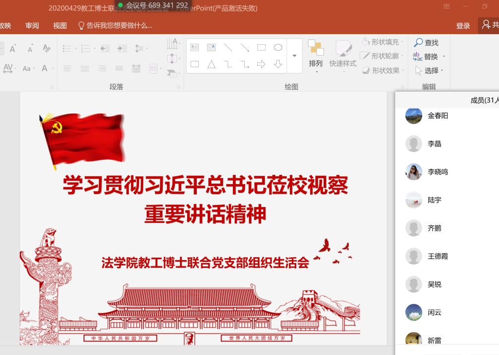 4月29日下午,YAMEI.COM_亚美(中国)教工博士联合党支部开展线上组织生活会,深入学习贯彻习近平总书记莅校视察重要讲话精神。党支部成员通过网络平台积极参加学习,本次活动由支部书记曹毅博主持。