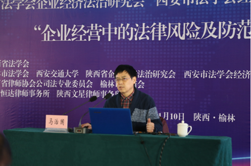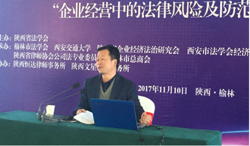 陕西省法学会企业经济法治研究会总顾问、YAMEI.COM_亚美(中国)YAMEI.COM_亚美(中国)马治国教授做了题为《企业经营中的知识产权风险防范》的主题报告,马教授的报告深入贯彻了党的十九大精神,指出中华民族站起来靠武装斗争、富起来靠改革开放,强起来靠创新知识产权。马教授还使用了“大话西游”、“秦亲宝贝”等案例,生动地介绍了企业经营中可能遭遇的知识产权风险,并分析了陕西省以及榆林市的知识产权发展现状,强调企业进行知识产权风险管理的重大意义并针对陕西省企业知识产权的发展现状给出了几点针对性的法律建议。