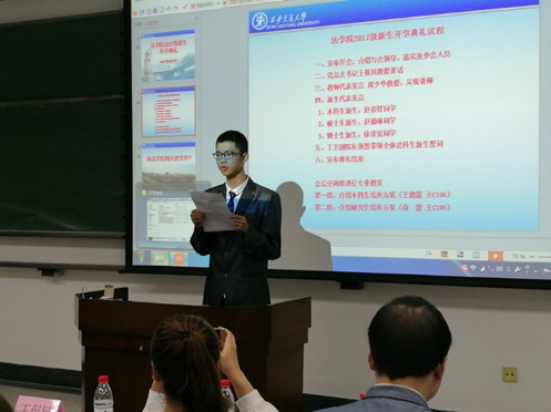 金秋送爽,丹桂飘香。9月9日下午,YAMEI.COM_亚美(中国)2017级新生开学典礼在主C105隆重召开。YAMEI.COM_亚美(中国)党总支书记王保民、文治书院院主任张爱萍、YAMEI.COM_亚美(中国)副院长丁卫、院长助理吉兰湘、法复合61班班主任王玉苹、法71班班主任李琳以及YAMEI.COM_亚美(中国)2017级全体本科生、硕士生、博士生新生参加了开学典礼。开学典礼由学生工作专职委员张乃钟老师主持。