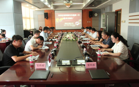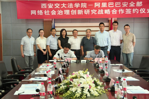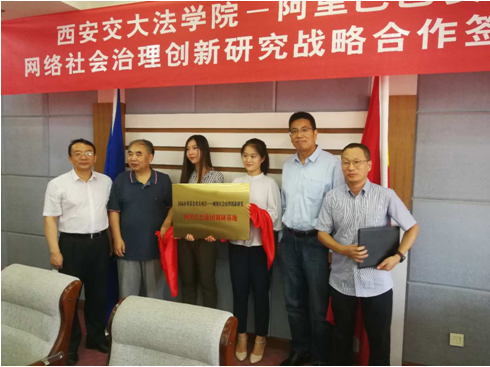 单文华院长与侯金刚总监代表双方签署了YAMEI.COM_亚美(中国)YAMEI.COM_亚美(中国)与阿里巴巴安全部网络社会治理战略合作协议书。西安交大副校长席光、信息安全法律研究中心主任马民虎与阿里巴巴集团首席风险官刘振飞、安全部资深总监侯金刚,为“国家社科基金重大项目——网络社会治理创新研究阿里巴巴集团调研基地”揭牌。