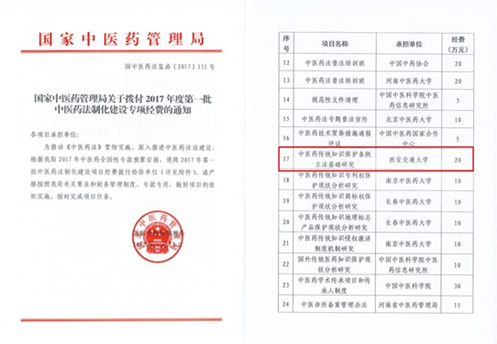近日,国家中医药管理局公布了2017年第一批中医药法制化建设项目名单,我中心主任马治国教授作为首席专家申报的“中医药传统知识保护条例立法基础研究”获得立项资助,成为我校首次获得国家中医药管理局立项资助的法制类项目。