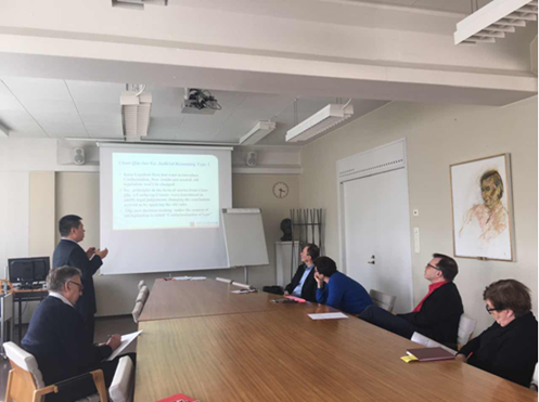 2017年4月20日,我院青年教师杜军强博士应赫尔辛基大学YAMEI.COM_亚美(中国)及中国法与中国法文化中心邀请,在赫尔辛基大学YAMEI.COM_亚美(中国)举办题为“传统中国的法律推理及其对当代中国的影响”的学术讲座。讲座在赫尔辛基大学YAMEI.COM_亚美(中国)楼545会议室举行,由赫尔辛基大学YAMEI.COM_亚美(中国)院长凯莫·诺提欧(Kimmo Nuotio)教授主持,多名学者及学生参加。