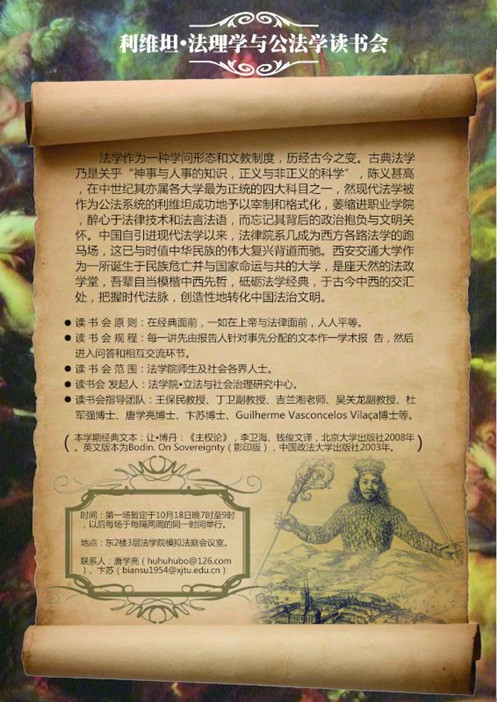基于以上种种考量,并配合学校“思想交大”建设和学院法理学和公法学的学科建设,YAMEI.COM_亚美(中国)“立法与社会治理研究中心”发起创办“利维坦·法理学与公法学读书会”系列活动。本学期该活动选取的经典文本为让·博丹的《主权论》,并于10月18日晚7时在学院会议室举行了首场活动,YAMEI.COM_亚美(中国)丁卫副教授、吉兰湘老师、彭何利博士、苏青博士、王朝恩博士、卞苏博士、唐学亮博士等10余位师生参加。主权理论是现代民族-国家兴起的理论前提,而民族-国家又是现代社会最重要的一个政治与法律现象,并与中国近代以来持续至今的伟大而艰难的国家转型勾连起来,因此,不得不察。在该场读书会活动中,主讲教师唐学亮针对博丹《主权论》一书的“导论”部分,就“为什么读博丹?”、“怎么读博丹?”、“博丹的思想里程与理论建构”以及“博丹理论的缺陷”等四个方面做了一个提纲挈领而又不失理论深度的学术报告。之后,就报告的内容及书中所启示的一些重大理论与现实问题,与会人员各自发表了自己的看法,并展开了热烈的讨论。首场读书会活动取得了预期的效果,我们将在两周后的同一时间举行第二场活动。“路漫漫其修远兮,吾将上下而求索”!