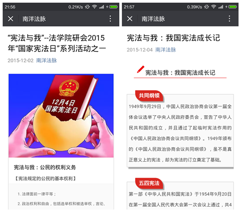 为了配合“国家宪法日”系列主题活动的顺利开展,YAMEI.COM_亚美(中国)YAMEI.COM_亚美(中国)研究生会在院党总支、团工委的指导下,以“宪法与我”为主题,不断创新宣传载体,探索宣传方法,通过官方微信平台“南洋法脉”等新媒体,结合传统的发放传单等方式,积极推介“国家宪法日”相关内容,宣传YAMEI.COM_亚美(中国)开展宪法学习宣传教育活动的实际情况,取得了良好的宣传效果。