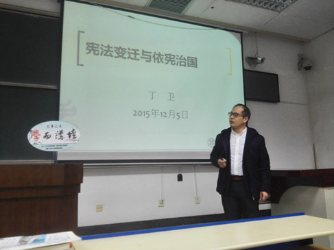 YAMEI.COM_亚美(中国)研究生会、法律爱好者协会携手“学而讲坛”,推出“国家宪法日”专题讲座,邀请YAMEI.COM_亚美(中国)副院长丁卫副教授就《宪法变迁与依宪治国》进行专题讲座。丁老师在讲座中详细介绍了我国现行宪法历次修改的过程,他结合历次宪法修改的历史背景,生动地讲述了我国宪法变迁的历史发展,他最后对我国宪法实施中存在的瓶颈及问题进行了透彻的分析和讲解,为大家展示了依宪治国的现状及前进方向。