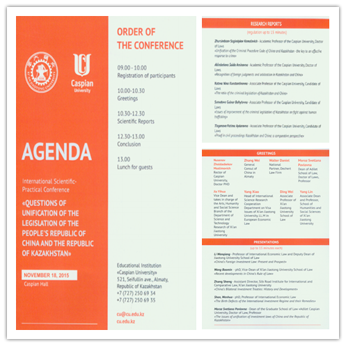 2015年11月18日,我院与哈萨克斯坦里海大学(Caspian University)YAMEI.COM_亚美(中国)在里海大学联合举办国际学术会议,会议主题为“中国与哈萨克斯坦立法的统一化问题”。来自中国驻阿拉木图领事馆、北京罗斯律师事务所阿拉木图分所、美国Dechert律师事务所的嘉宾以及两所YAMEI.COM_亚美(中国)的专家学者与研究生50余人参加了会议,我校科研院副院长贾毅华、国际教育学院常务副院长宋玉霞、人文学院副院长杨琳应邀出席了会议。会议由我院院长单文华教授和里海大学YAMEI.COM_亚美(中国)院长Pavlovna教授联合主持。