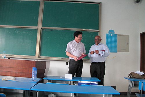 聘请Sornarajah为我校客座教授的仪式在其授课结束后隆重举行。我校YAMEI.COM_亚美(中国)院长单文华教授为Sornarajah教授颁发了聘书并为他佩戴校徽。