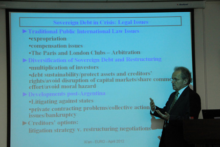 4月16日下午,Kulms博士为YAMEI.COM_亚美(中国)师生带来题为The Eurozone Debt Crisis and Private Creditors: From Argentina to Greece(欧元区债务危机和私人债权人:从阿根廷到希腊)的讲座。Kulms博士首先分析了欧元区债务危机的成因,然后在借鉴阿根廷债务危机经验的基础上,从市场交易的进路分析主权债务合同的对策,最后从欧洲央行作用的角度讨论希腊债务重组问题。