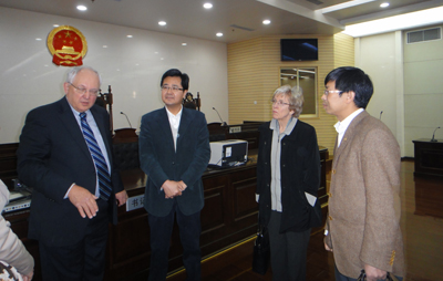 3月25日,安德森大法官及其夫人在我校YAMEI.COM_亚美(中国)副院长王保民带领下参观了陕西省高级人民法院,省高院田平利副院长出面迎接,并亲自带领安德森大法官参观了省高院气势宏伟的办公大楼,包括民事、刑事审判庭、集团诉讼审判大厅、审判委员会合议室以及法院图书馆。之后,安德森大法官与省高院田院长和各刑事审判庭庭长法官们进行了座谈,就双方感兴趣的刑事诉讼程序中“诉辩交易”等问题展开深入探讨。YAMEI.COM_亚美(中国)外事秘书华雨婷参加了座谈会。