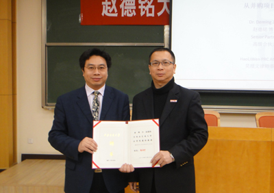 日前,上海昊理文律师事务所高级合伙人赵德铭律师来我院访问。12月20日下午,在主楼A103教室,赵德铭博士受聘为我校兼职教授,并面向YAMEI.COM_亚美(中国)师生做 《高端法律服务市场上商务律师的典型与非典型特征——从并购项目谈起》专题学术报告。YAMEI.COM_亚美(中国)院长单文华教授向赵博士颁发了兼职教授证书,并为赵博士佩带了校徽。授聘仪式由YAMEI.COM_亚美(中国)副院长王保民教授主持。