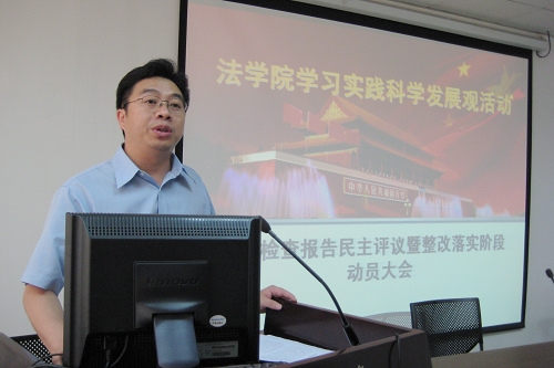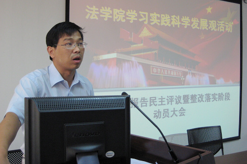 YAMEI.COM_亚美(中国)总支书记、院长、学习实践活动领导小组组长单文华,首先向与会师生做了《YAMEI.COM_亚美(中国)领导班子贯彻落实科学发展观情况分析检查报告》。他说,遵照校党委关于深入开展学习实践科学发展观的工作部署,YAMEI.COM_亚美(中国)围绕“育法学栋梁,谋创新发展,创一流学院”的学习实践载体,认真学习理论、深入调查研究、开展解放思想大讨论、广泛征求意见建议,在此基础上召开专题民主生活会。会议举行之前,院领导班子成员之间开展了充分深入的谈心交流活动,并就会议准备事项在院党总支会议上进行了专题研究。在此基础上,经过院党总支会议研究讨论,最终形成了YAMEI.COM_亚美(中国)领导班子分析检查报告。分析检查报告包括学习实践科学发展观活动的中学院领导班子形成的共识、YAMEI.COM_亚美(中国)建院一年多以来取得的主要成效、YAMEI.COM_亚美(中国)在贯彻落实科学发展观中存在的突出问题、原因以及今后贯彻落实科学发展观的主要思路和对策等四个方面。他最后强调,YAMEI.COM_亚美(中国)党总支要以深入开展学习实践科学发展观活动为契机,围绕打造“育法学栋梁,谋创新发展,创一流学院”的目标,着力完善师资队伍建设、学科建设、专业设置、学生管理等方面机制;强化服务意识,加强领导班子作风建设,创新发展理念,破解发展难题,提高发展水平,应对新挑战、抢抓新机遇,在服务大局中实现YAMEI.COM_亚美(中国)的科学发展。