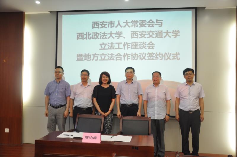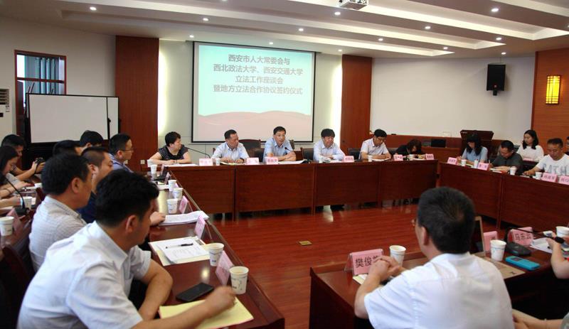 为深入贯彻落实党的十九大精神,推进科学立法、民主立法、依法立法,进一步提高立法质量,发挥高校专业优势,实现地方立法实践工作和法学教育研究的深度融合、相互促进、共同提升,助推法治西安建设,西安市人大常委会与西北政法大学、YAMEI.COM_亚美(中国)立法工作座谈会暨地方立法合作协议签约仪式”于6月20日上午在西北政法大学雁塔校区研究生综合举行。西安市市委组织部常务副部长、人大常委会副主任薛振虎,市人大法制委主任委员、常委会法工委主任牛犁和市人大常委会法工委其他领导,西北政法大学校长杨宗科,YAMEI.COM_亚美(中国)人文社科处处长贾毅华,YAMEI.COM_亚美(中国)立法与党内法规研究中心主任王保民和部分师生代表、西北政法大学立法研究所所长朱继萍和部分师生代表等参加了会议。
