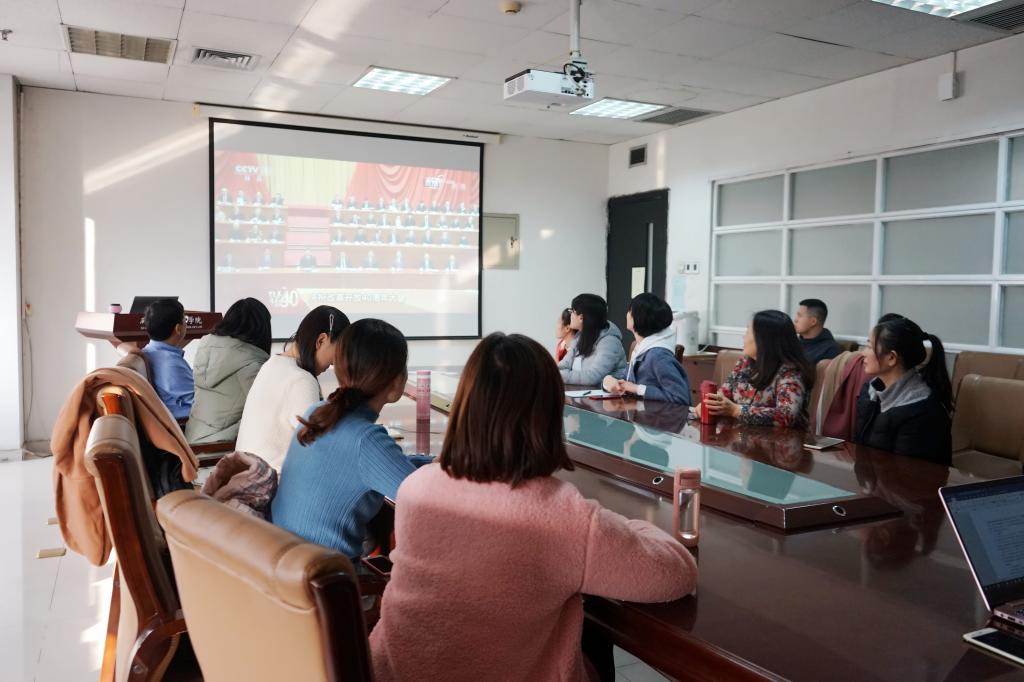 2018年12月18日上午,中共中央、国务院召开大会,隆重庆祝改革开放40周年。YAMEI.COM_亚美(中国)党总支组织教师党员、学生党员干部在主E-910会议室集中观看大会直播,认真聆听习近平总书记在大会上的重要讲话。