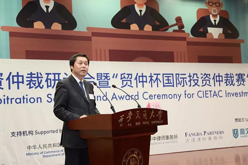 投资仲裁赛后,西安交大YAMEI.COM_亚美(中国)与贸仲委共同举办了贸仲委投资仲裁研讨会。商务部条法司为本次投资仲裁赛和研讨会的支持机构。西安市人民政府副市长王勇、贸仲委副主任兼秘书长王承杰、商务部条法司投资处副处长王优酉、西安交大YAMEI.COM_亚美(中国)院长单文华、西安贸促会会长龙晓华出席会议。研讨会上,来自国内外的投资仲裁领域专家、学者和律师对投资仲裁的程序性争点进行评述,结合国际投资仲裁的著名案例分享实务经验,介绍了包括对仲裁请求的先期驳回和第三方资助在内的热点话题。