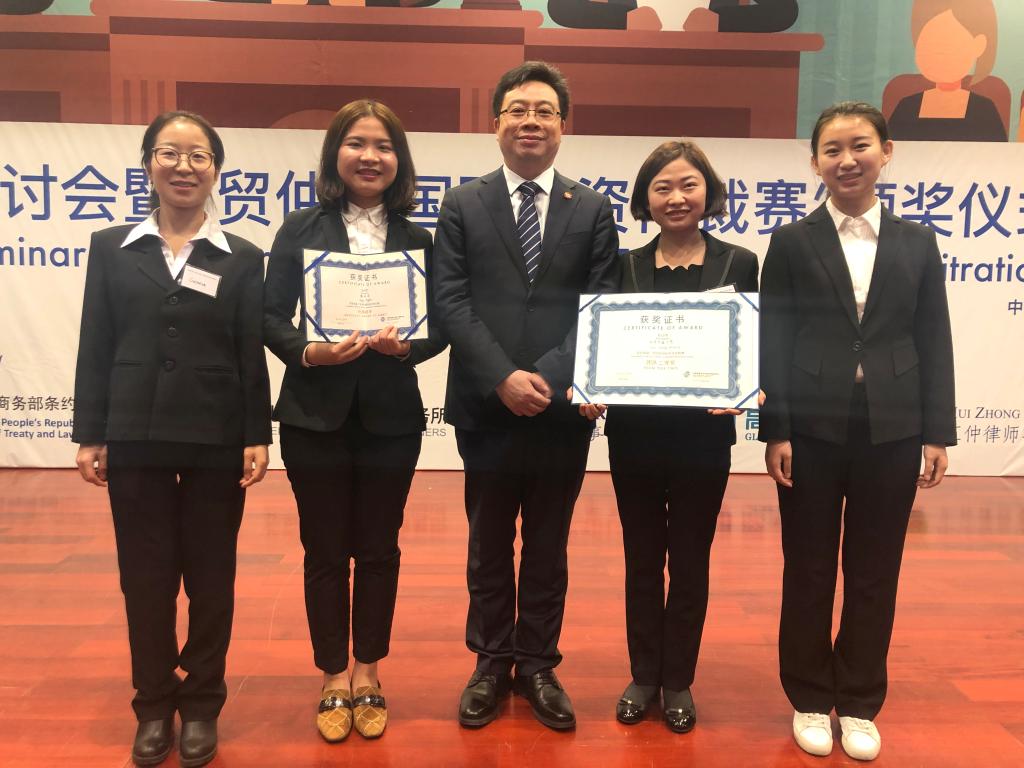 西安交大参赛队伍由2017级研究生张艳、2015级本科生李文鑫、廖倩以及2016级本科生熊平书组成,YAMEI.COM_亚美(中国)王朝恩、张生担任教练,单文华教授、李万强教授担任顾问,曾代表学校参加亚太地区第一届外国直接投资模拟法庭的队员王鹏博士和冯韵雅博士也提供了指导。队员们积极认真准备比赛,最终凭借扎实的投资专业知识,优秀的英语表达能力以及娴熟的法庭辩论技巧,获得仲裁员认可,在十四支代表队中脱颖而出,总分排名第四,获得团体二等奖,李文鑫和熊平书同学荣获“优秀辩手”称号。