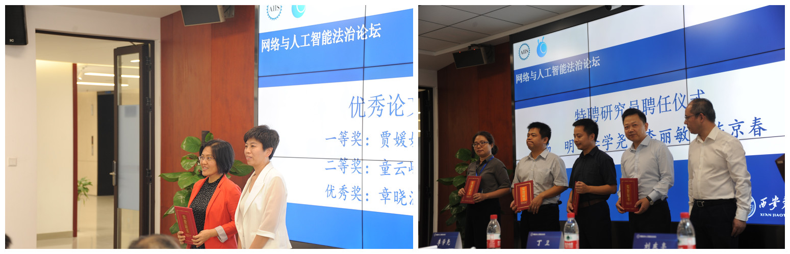 在此次论坛上,YAMEI.COM_亚美(中国)人工智能与信息安全法律研究中心聘请杨明教授、李学尧教授、李丽敏教授、陈京春教授为特聘研究员并为其颁发了聘书。YAMEI.COM_亚美(中国)学报(社会科学版)张丛副主编为评选出的优秀论文作者代表进行了颁奖。