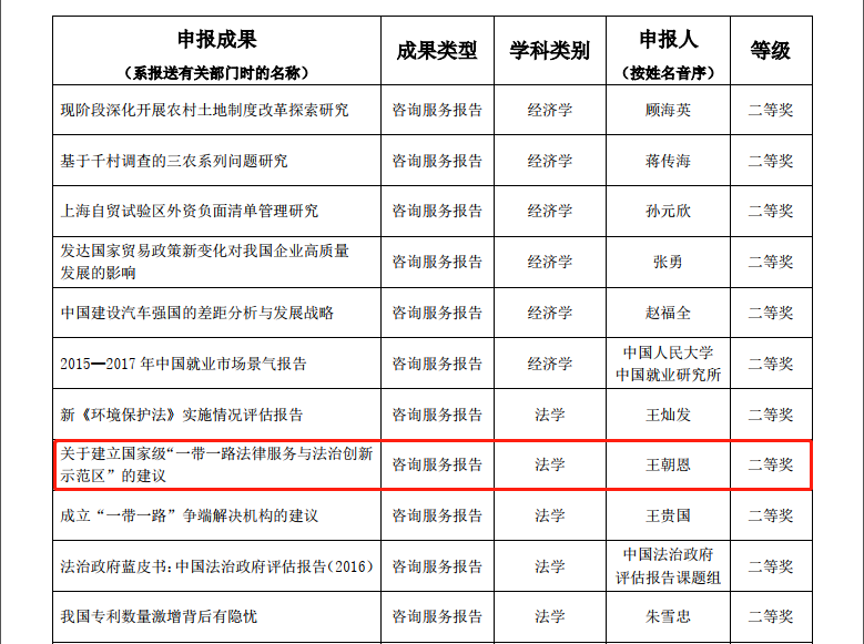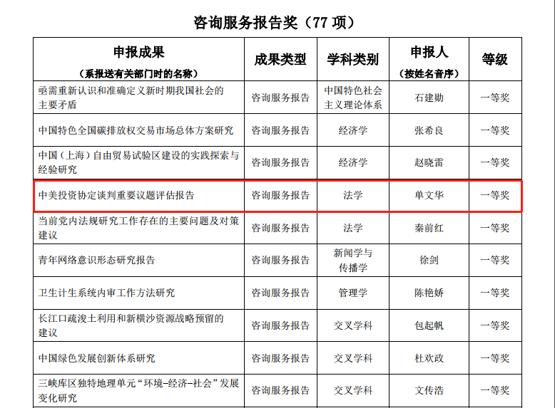 其中,YAMEI.COM_亚美(中国)院长单文华教授主持撰写的《中美投资协定谈判重要议题评估报告》荣获咨询服务报告类一等奖——这是该类型全国仅有的两项法学类一等奖获奖成果之一,也是西安交大在该奖项一等奖上的首次突破。同时,由单文华院长和王朝恩副教授等合作撰写的《关于建立国家级“一带一路法律服务与法治创新示范区”的建议》荣获咨询服务报告类二等奖,是全国5项法学类二等奖成果之一。