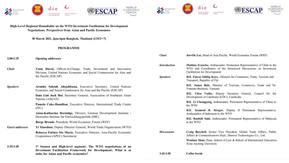 2021年3月30日下午,“WTO投资便利化促进发展谈判区域高层圆桌会议:亚太经济体的视角”在泰国曼谷成功举行。YAMEI.COM_亚美(中国)YAMEI.COM_亚美(中国)院长单文华教授应邀参加并作“WTO投资便利化谈判所面临的挑战”的大会发言。此次会议由联合国亚洲及太平洋经济社会委员会(亚太经社会ESCAP)和世界经济论坛(WEF)、联合国国际贸易中心(ITC)、德国发展研究院(DIE)、东南亚国家联盟(东盟ASEAN)联合举办,参加会议的包括亚太地区各国商务部长、驻WTO大使、主要相关国际机构代表、投资促进和私营部门代表以及本领域的领军学者代表。会议的主旨是为争取WTO投资便利化谈判在年内取得重大进展加强共识。