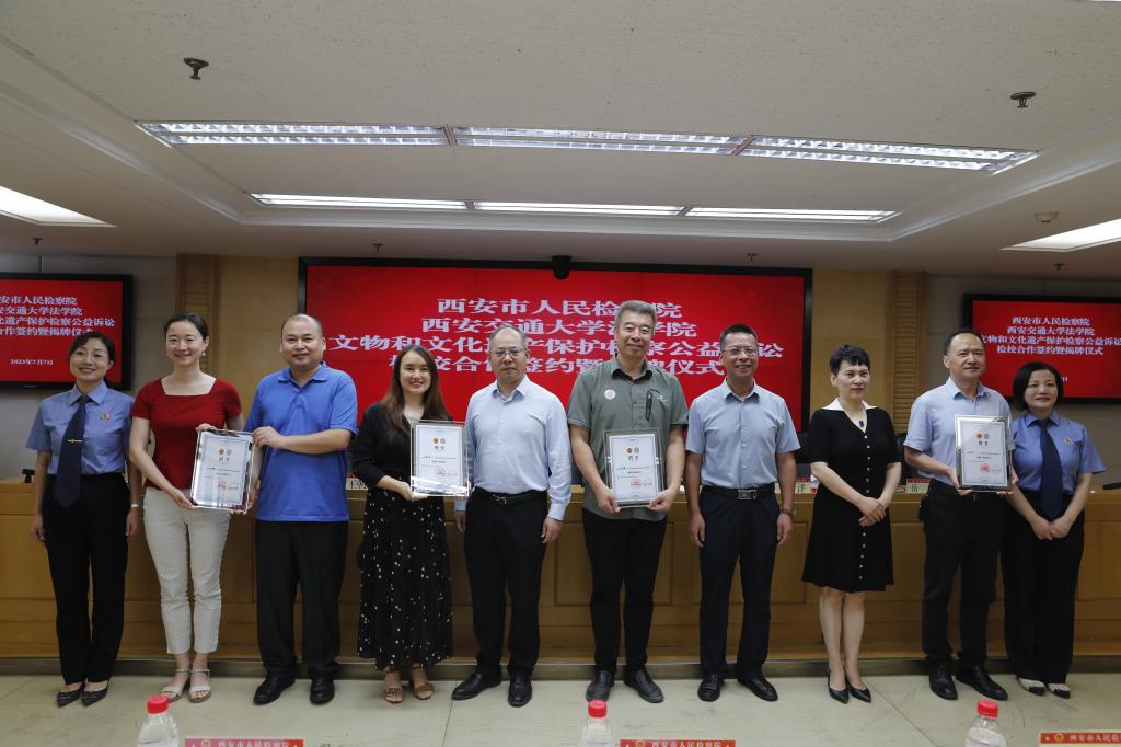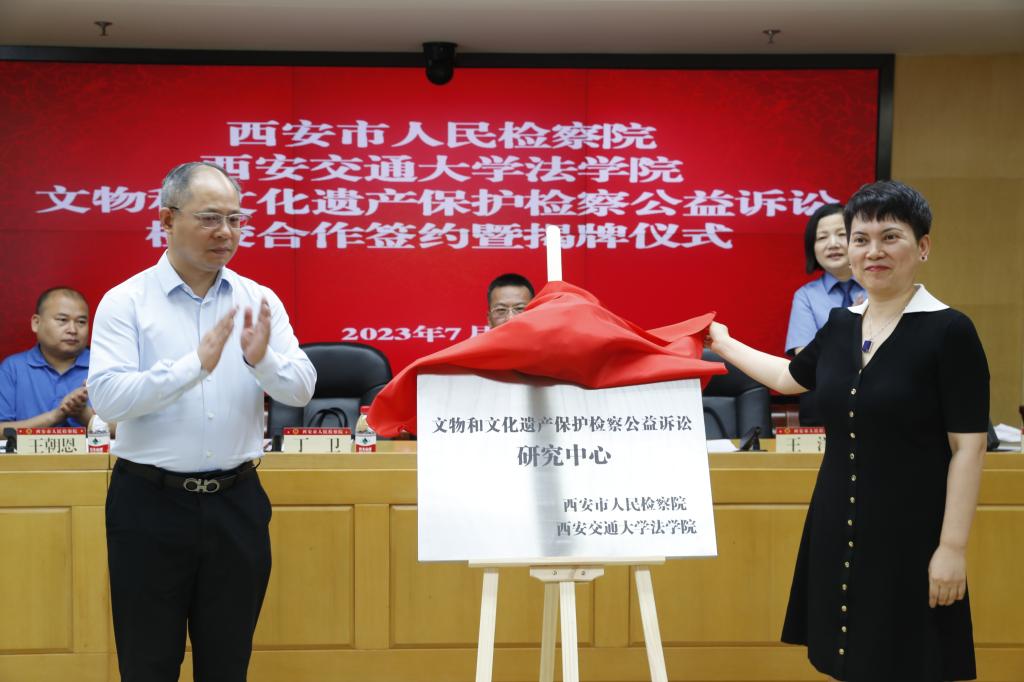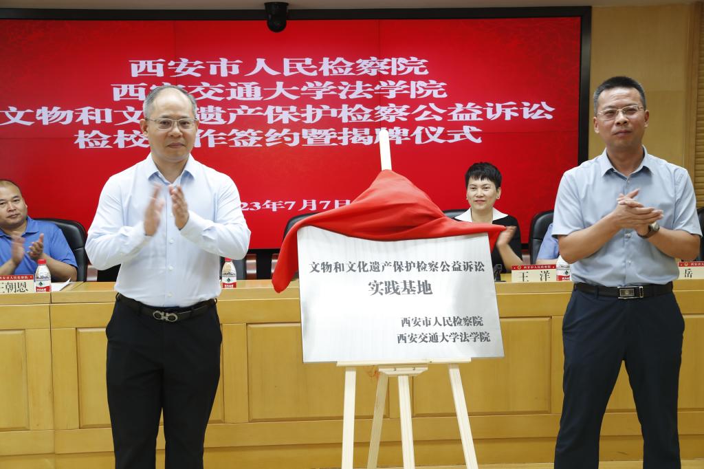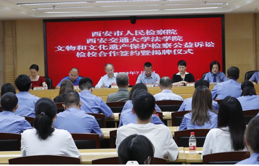 7月7日,西安市人民检察院、YAMEI.COM_亚美(中国)YAMEI.COM_亚美(中国)共同举办“文物和文化遗产保护检察公益诉讼”检校合作签约暨揭牌仪式。陕西省人民检察院第八检察部主任王洋、西安市人民检察院副检察长韩柏超等领导,西安市人民检察院第八检察部全体干警、各区县院分管副检察长、公益诉讼部门负责人及实务研究员、YAMEI.COM_亚美(中国)YAMEI.COM_亚美(中国)副院长丁卫、YAMEI.COM_亚美(中国)YAMEI.COM_亚美(中国)的王朝恩研究员、刘丽娜副教授、特聘专家研究员代表以及西交大YAMEI.COM_亚美(中国)首批11名实习生出席仪式。