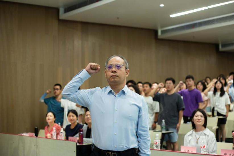 丁卫副院长带领全体法科生新生庄严宣誓:“公平所系,正义相托。在这庄严时刻,我郑重宣誓:我志愿投身法治事业,忠实履行一个法律人应尽的全部义务,恪守宪法,热爱祖国,忠于人民,弘扬法治精神,维护正当权益,勤勉诚信,清正廉洁。我决心竭尽全力,捍卫法律职业的圣洁与荣誉,养天地正气,行人间正道,求正义,尚卓越,为法治中国的繁荣发展和人类正义的美好未来奋斗终生!”