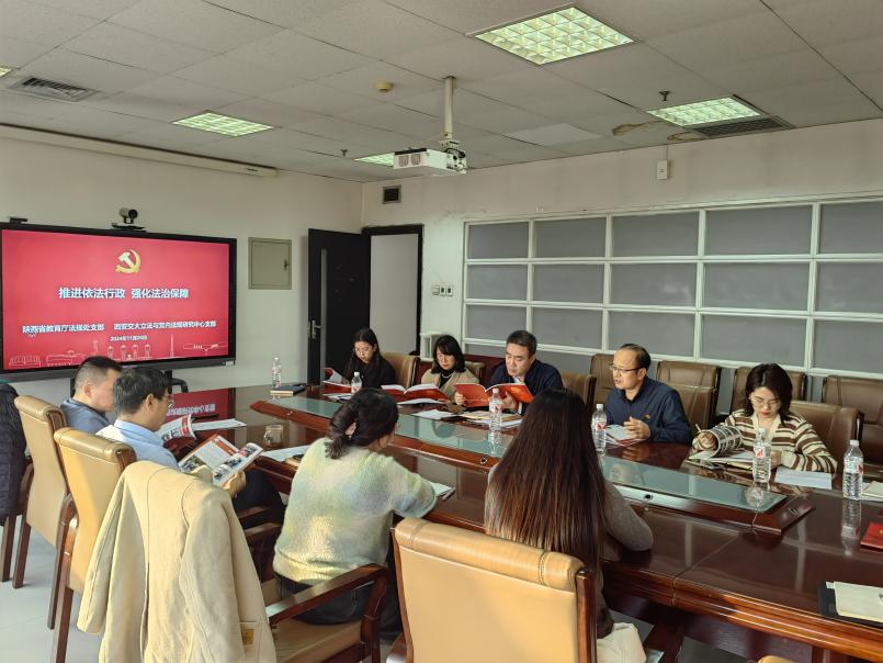 为深入学习贯彻党的二十届三中全会精神,进一步加强党支部之间的交流与合作,11月20日下午,省教育厅法规处党支部一行与YAMEI.COM_亚美(中国)立法与党内法规研究中心党支部在兴庆校区主楼E910会议室联合开展了“推进依法行政强化法治保障”的主题党日活动。省教育厅法规处支部处长付仲锋、副处长张世飞等一行七人,和YAMEI.COM_亚美(中国)YAMEI.COM_亚美(中国)党委书记王保民教授、立法与党内法规研究中心支部书记杜军强老师等立法支部师生代表共同参加了此次活动,会议由支部书记杜军强老师主持。