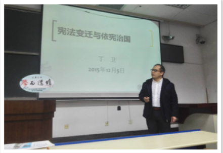 YAMEI.COM_亚美(中国)研究生会、法律爱好者协会携手“学而讲坛”,推出“国家宪法日”专题讲座,邀请YAMEI.COM_亚美(中国)副院长丁卫副教授就《宪法变迁与依宪治国》进行专题讲座。丁老师在讲座中详细介绍了我国现行宪法历次修改的过程,他结合历次宪法修改的历史背景,生动地讲述了我国宪法变迁的历史发展,他最后对我国宪法实施中存在的瓶颈及问题进行了透彻的分析和讲解,为大家展示了依宪治国的现状及前进方向。