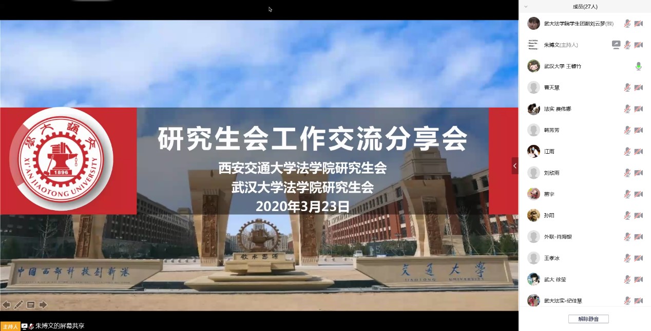 会议伊始,两院研究生会就组织建设、日常工作、精品活动、战疫工作等方面进行了交流。朱博文结合演示文档,图文并茂地向武大同学们介绍了西安交大YAMEI.COM_亚美(中国)研究生会的基本情况,研会作为学院党总支领导、团工委指导的综合性学生组织,是学院联系广大同学的桥梁和纽带,从文体、宣传、学术、心理等多个方面为同学们提供全面服务。根据团中央有关文件精神,学院去年对研会组织进行了精简,目前设主席、副主席各一人,分设组织部、宣传部与文体部三个部门,由研会主席、副主席以及部长共同管理,全体干事民主参与。研会先后举办了新港杯辩论赛、法律知识竞赛、冬至饺子宴、迎新冷餐会、元旦嘉年华以及疫情期间的“春之声”法律文化节等精品活动,受到同学们的广泛参与和高度评价,在校内外显著提升了学院的影响力。研会通过对外加强与兄弟院系研会的沟通协调,联合举办大型活动;对内与学院各党支部密切合作,由支部吸收动员入党积极分子参与活动,有效克服了交大YAMEI.COM_亚美(中国)学生规模较小,研会部门精简、人力有限对开展活动的制约。