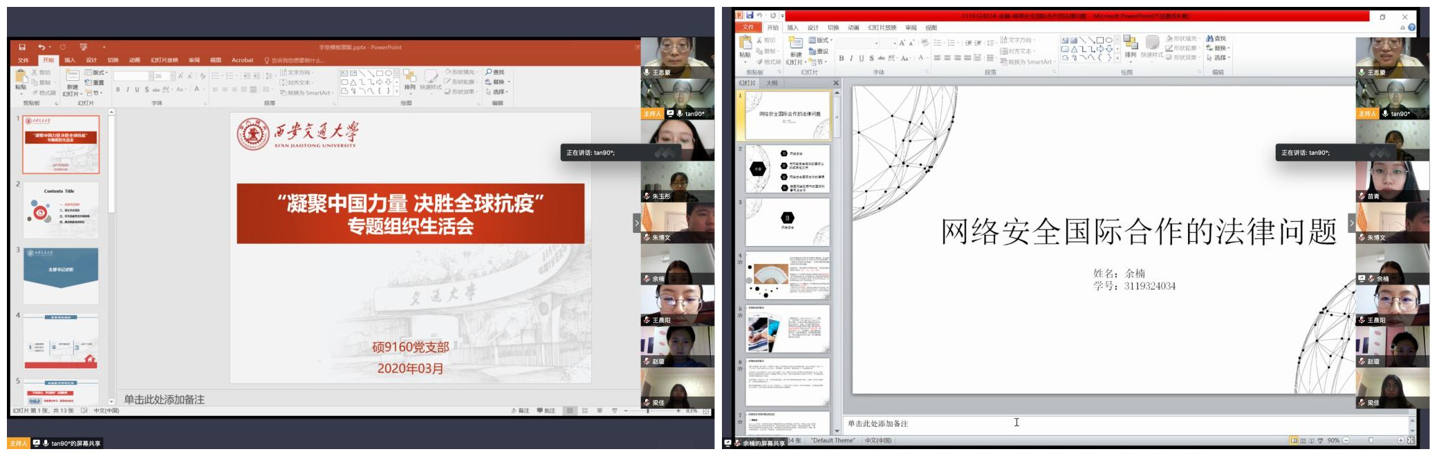 3月23日晚,西安交大YAMEI.COM_亚美(中国)与武汉大学YAMEI.COM_亚美(中国)联合举办“武爱交友,与子同袍”分享交流会,朱博文、孙阳分别就研会建设、支部工作与武大同学分享心得、畅谈经验,两校法科学子对近期“抗疫”工作展开热烈讨论。“武大YAMEI.COM_亚美(中国)研会组织健全完善,活动丰富多彩,各位同学的分享干货满满,令人受益匪浅”,支部党员、YAMEI.COM_亚美(中国)研会主席朱博文表示,“我们将组织专题研究,吸收借鉴有益经验,更好地为交大同学们服务”。“武大医学部白衣执甲、坚守阵地,交大医学部逆行出征、千里驰援,共同凝聚起抗击疫情的钢铁长城”,孙阳在总结发言中表示,“待疫情散去、山河无恙之时,希望大家可以实地交流,轻抚兴庆湖畔的秦砖汉瓦,品味珞珈山上的荆风楚韵。”